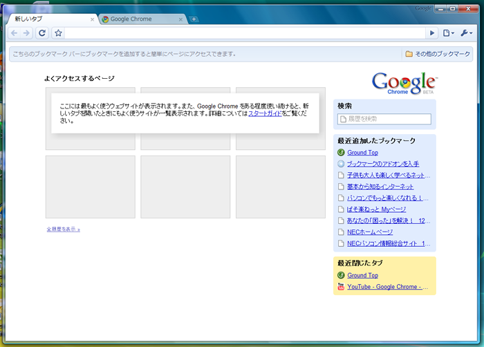 下段には空白ページの時にはブックマークバーが出ます。(設定で常時出す事も可能)