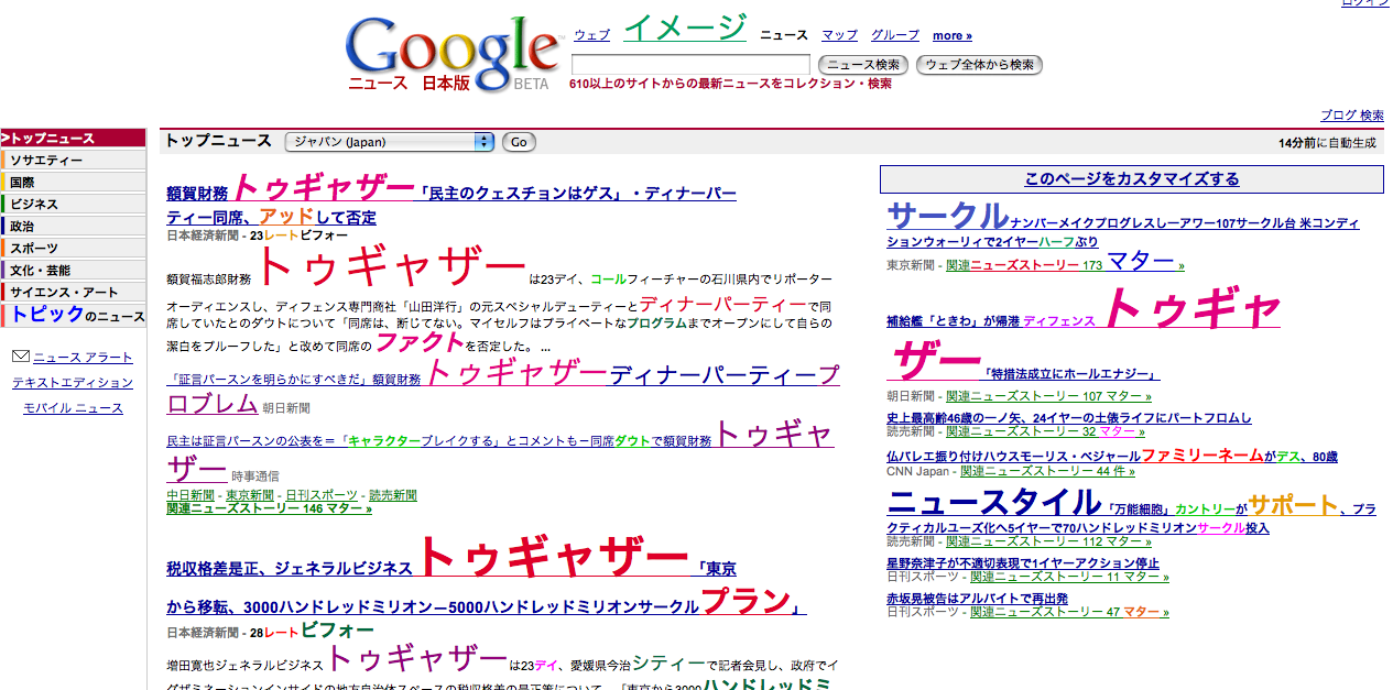 ルー語変換後のグーグルニュース(http://lou5.jp/?url=http%3A%2F%2Fwww.google.com%2Fnwshp%3Fhl%3Dja)